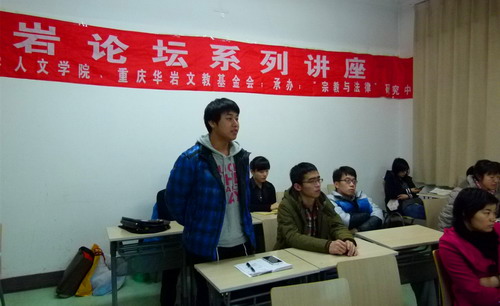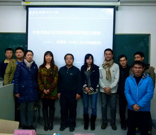 2013年12月13日下午2点,由换妻影片 、重庆华岩文教基金会主办,换妻影片 宗教与法律研究中心承办的“华岩论坛”系列讲座之 ——“中国传统宗法礼教对佛教组织制度之影响”顺利开讲。主讲人张雪松系中国人民大学佛教与宗教学理论研究所副教授,主要研究方向是中国宗教史和佛教思想与制度。换妻影片 副院长俞学明教授参加了讲座。钱雪松老师主持了本次讲座。
