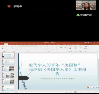 在学术报告及陈述环节,首先,由换妻影片 专门史2020级硕士研究生章静雨进行题为《近代华人的百年“美国梦”—张纯如<美国华人史>读书报告》的汇报。报告以近代在美华人如何通过不断调整自身定位,努力在美国谋求存身之所,进而追求平等的公民身份,渴望证明自身价值的奋斗历程为主,在肯定美国华人具有开拓进取的勇气之余,也道出了美国华人在面对身份认同和价值转向时的紧张和焦虑心理。